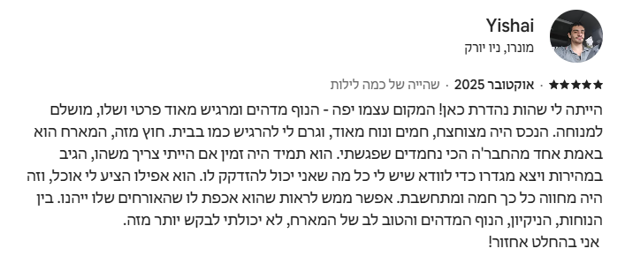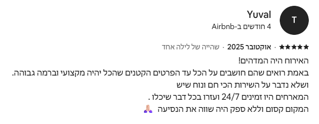 ✔ שירותיות וזמינות מלאה – מענה מיידי לכל בקשה או בעיה, כדי שהחוויה שלכם תישאר מושלמת וללא הפרעות.